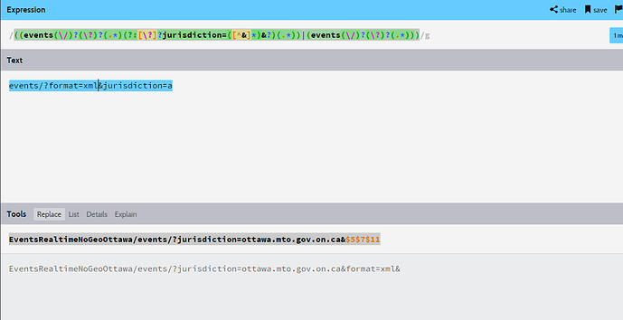 Replace Patter: EventsRealtimeNoGeoOttawa/events/?jurisdiction=ottawa.mto.gov.on.ca&$5$7$11